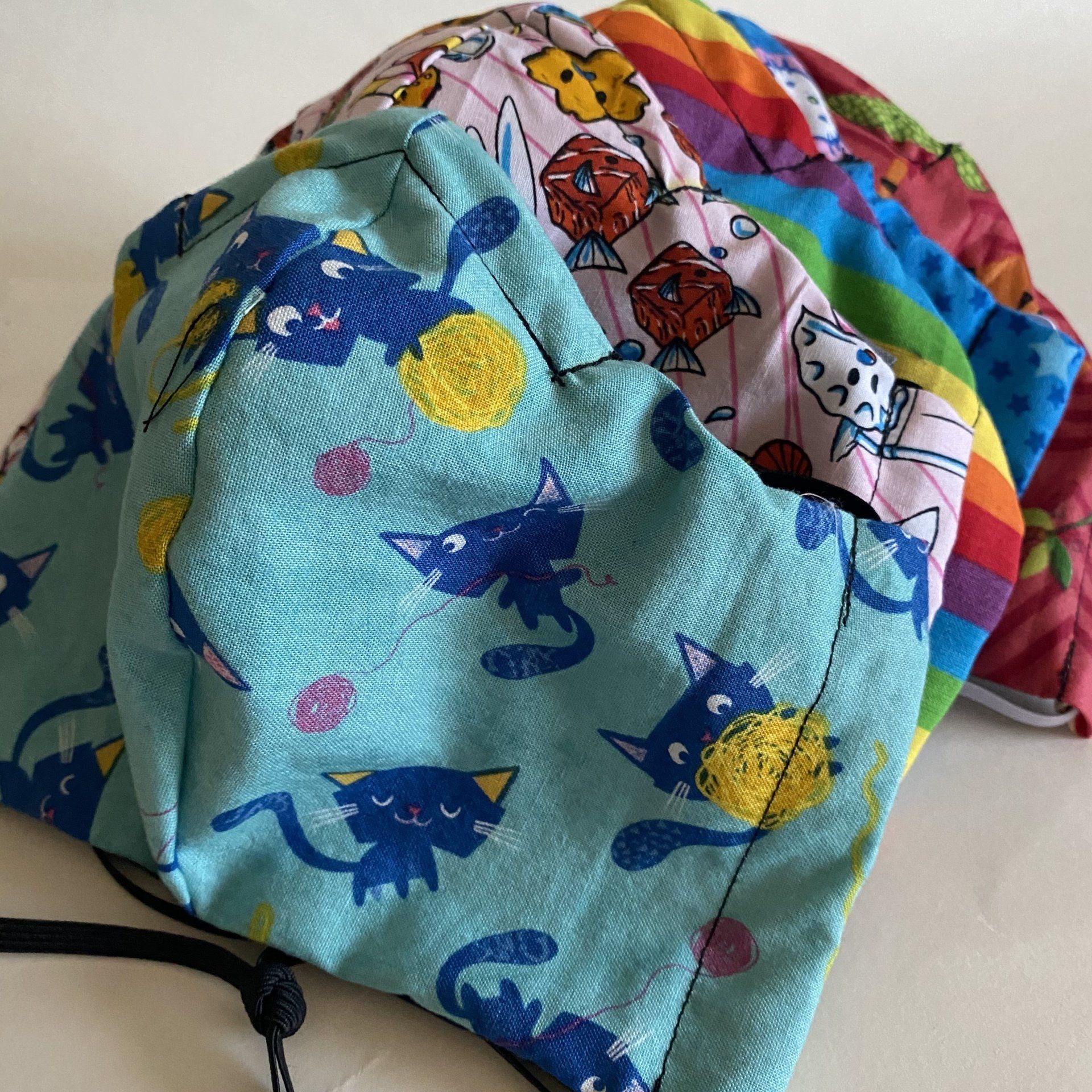 I think the one of the best feelings I have when making masks or scrunchies, is seeing them on people on social media or in the wild. Some of the fabrics that I use for the frontline healthcare workers facial covering are in short supply so they aren’t available to the public. One of my favorites is the playful kitty pattern that was donated to me. Which fabric is your favorite?