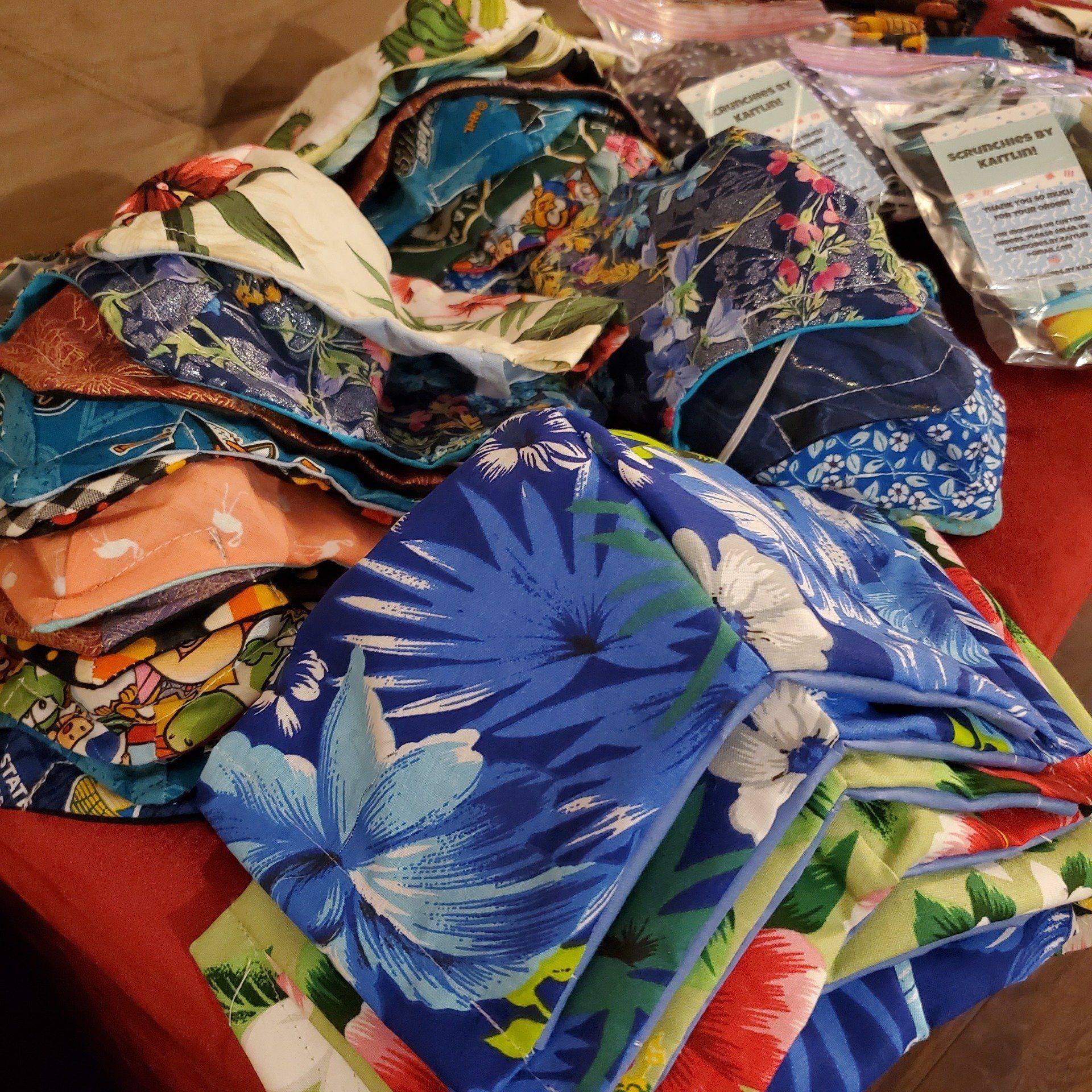 I think the one of the best feelings I have when making masks or scrunchies, is seeing them on people on social media or in the wild. Some of the fabrics that I use for the frontline healthcare workers facial covering are in short supply so they aren’t available to the public. One of my favorites is the playful kitty pattern that was donated to me. Which fabric is your favorite?
